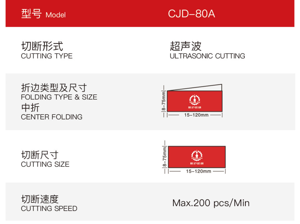 | 220V | 3.0KW | 0-240 PCS/MIN. | 450KGS | 1.48X1.08X1.33M | Ultrasonic Cut (Hot Cut & Cold Cut |